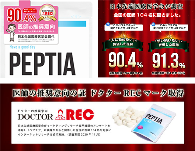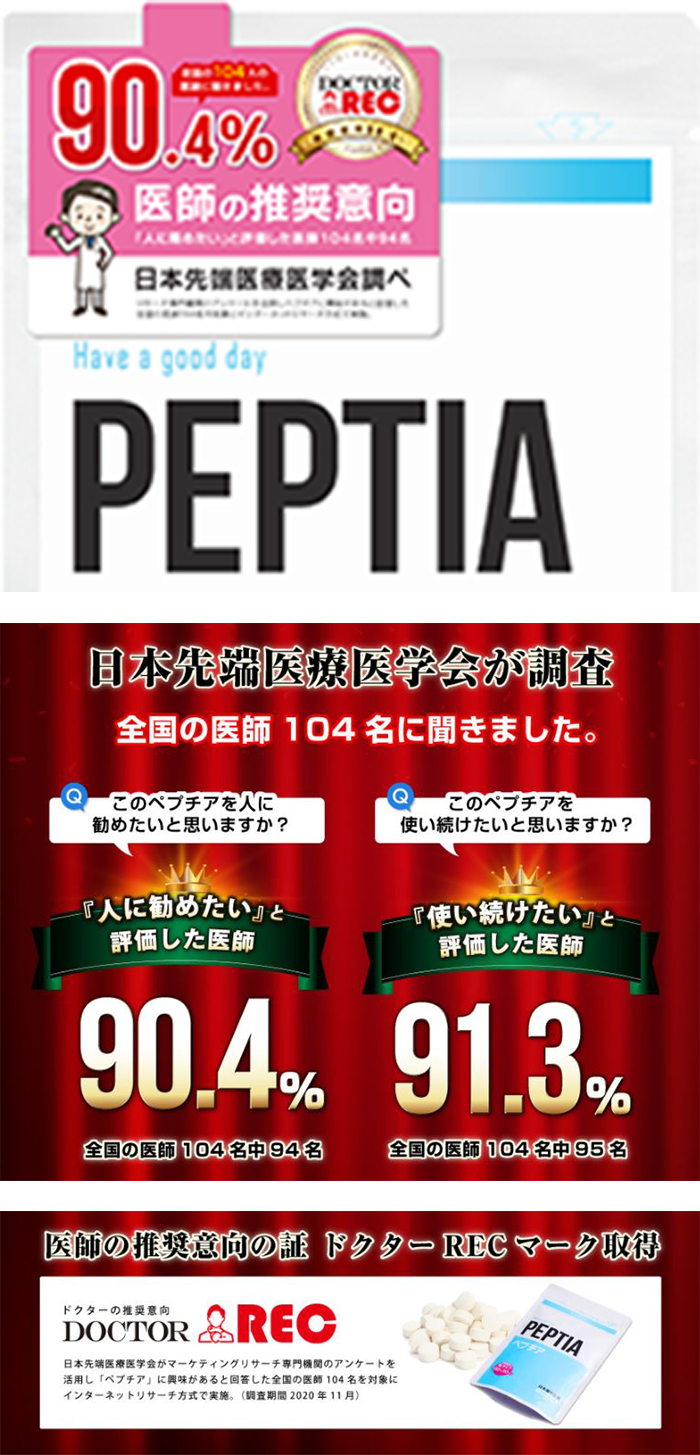 一般社団法人 日本先端医療医学会が行った調査では全国の医師104名中94名が「ペプチアを人に勧めたい」と回答し、「ペプチアを使い続けたいか?」という使用意向に関しても104名中95名と、実に91.3%の医師が『使い続けたい』と評価しています。