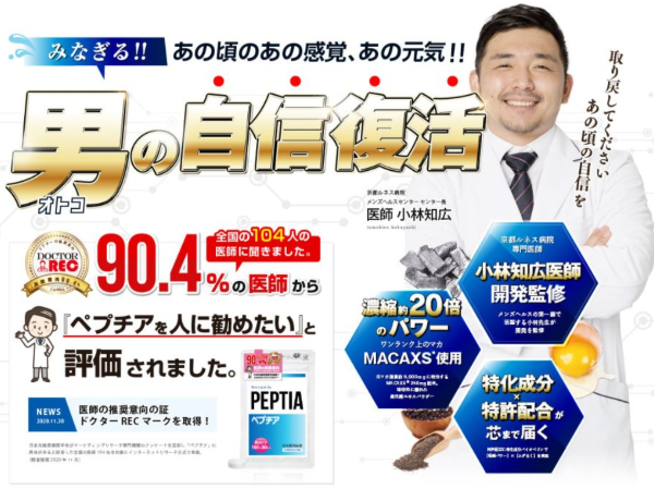 そんな男性サプリ、ペプチアですが、今までのメンズサプリと比べて圧倒的に評価できるところがあります。 泌尿器科専門医が監修したサプリメントというだけあって、成分や特許配合が評価され、全国の医師からも推奨されている点です。